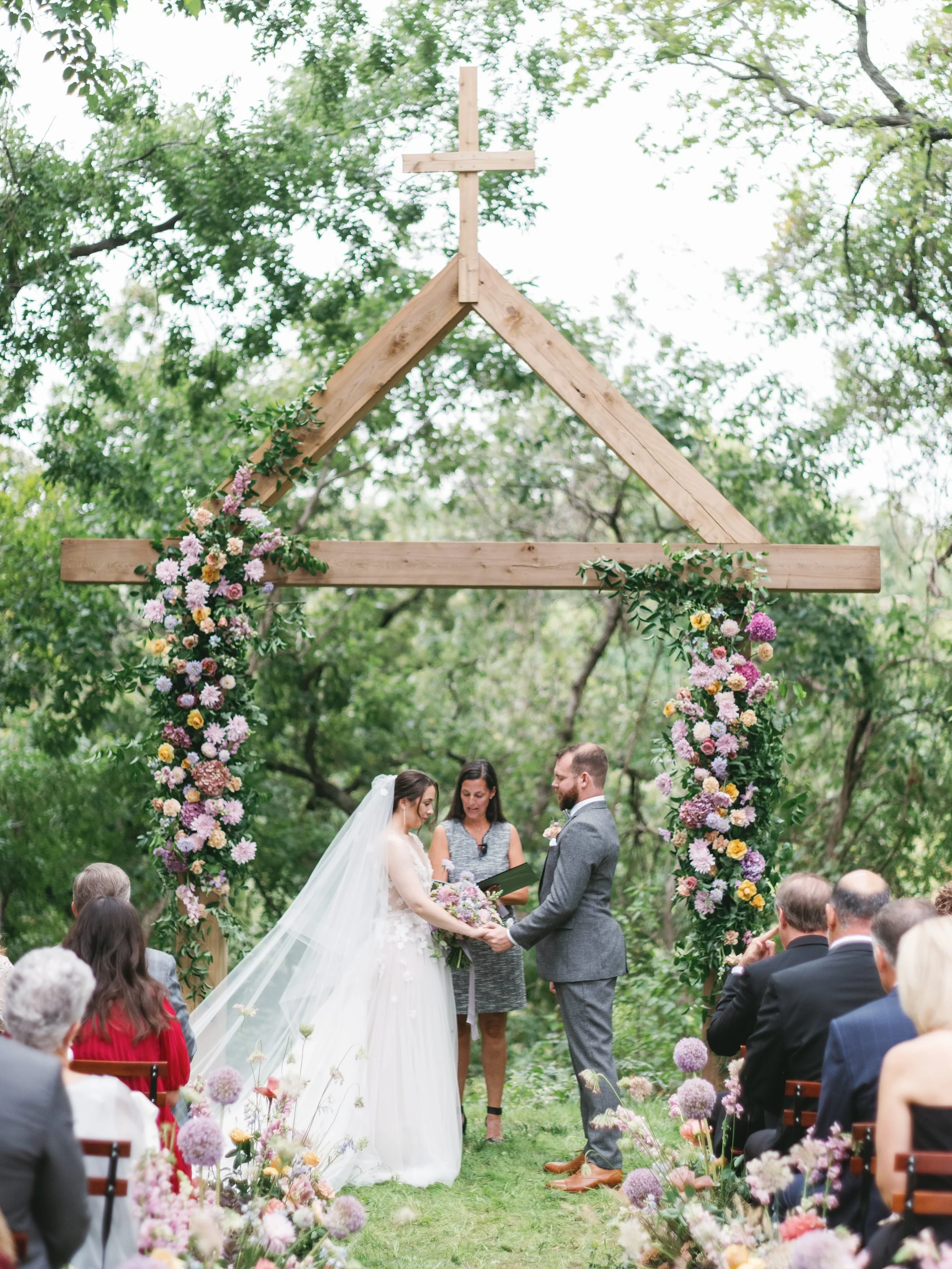 Kaelan and Patrick’s garden wedding at Kaelan’s family home was one of the most magical days ever. I could relive this over and over again. I loved that they made an outdoor chapel and that there were so many personal details that were so special to them. They had a beautiful gold lock that they attached to the gate. The beautiful arbor of greenery and florals was an entry way into the reception and a favorite piece of the wedding to them. Kaelan’s parents worked so hard on the landscape and florals all around the property and it really showed. Everything was so enchanting and romantic and so perfectly them.